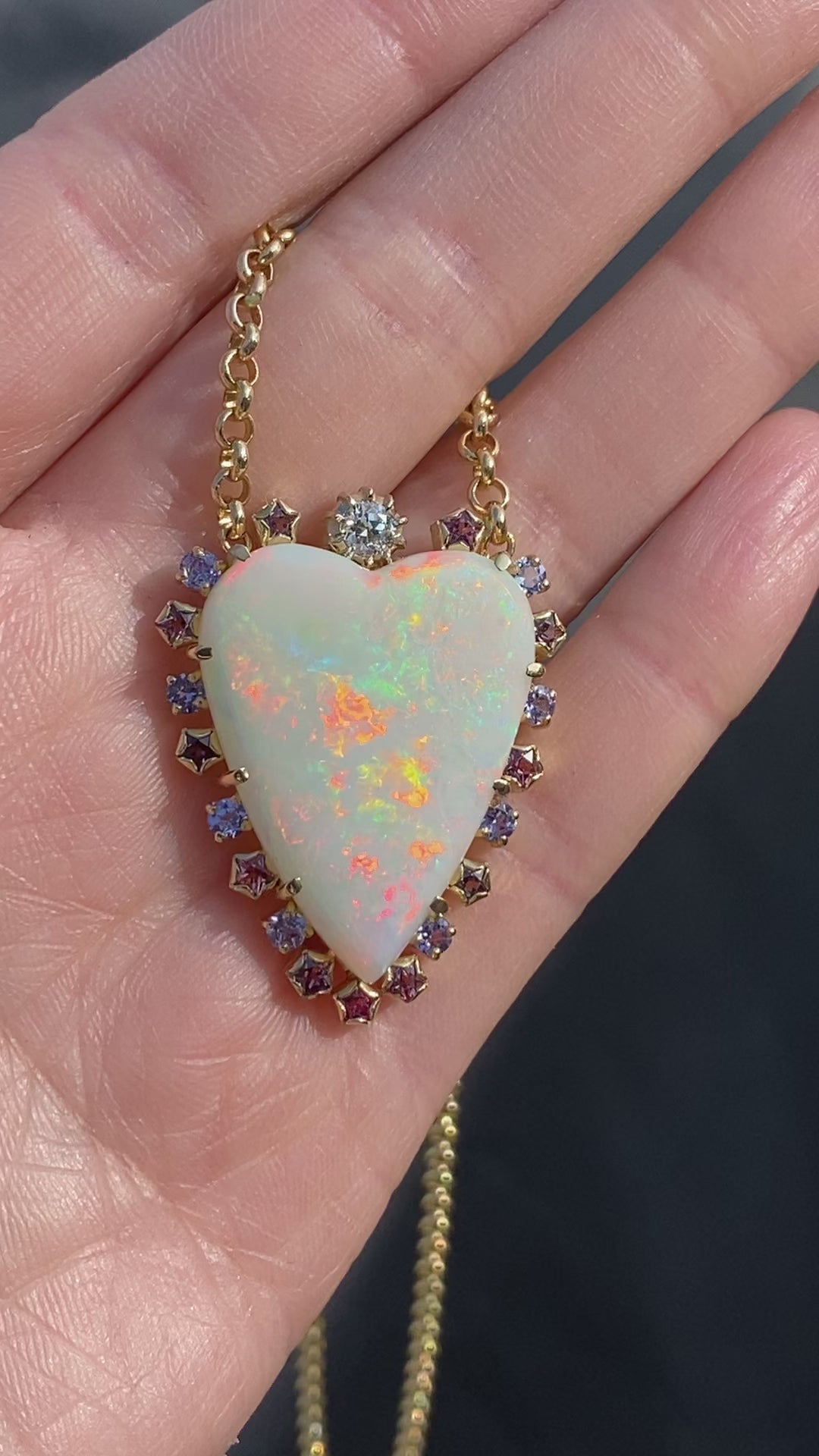 This necklace features one of our largest Australian Opal hearts. This opal displays pinks, reds, oranges, greens, and blues. Hand crafted in 18 karat yellow gold, complete on a 14 karat 18" perfect round link chain.