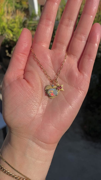 From our Light Collection, this charm features an eye catching Australian opal that flashes a kaleidoscope of color, sitting in the center of a heart shaped light charm. Crafted in 14k yellow gold and completed with a white diamond accent. Made with a 3mm bail opening, this charm is ready for a chain of your choosing. You can find a selection of our chains here.