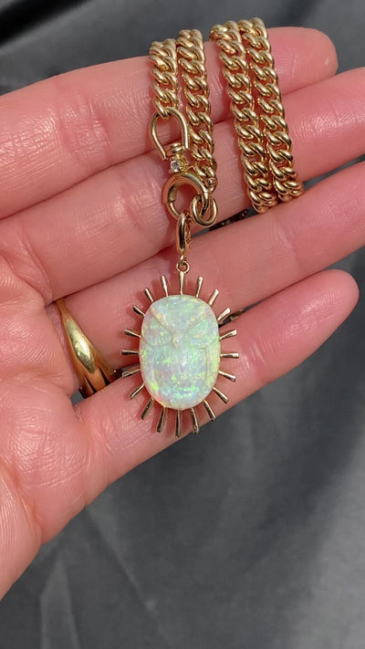 We are excited to offer one of the first Divine Light charms with a unique, hand carved Australian Opal owl. The Owl symbolizes wisdom, change, and transformation. Set in 14 karat yellow gold, this charm is complete with a "push to open" bail and is ready for a chain of your choosing. Find a selection of our favorite chains here