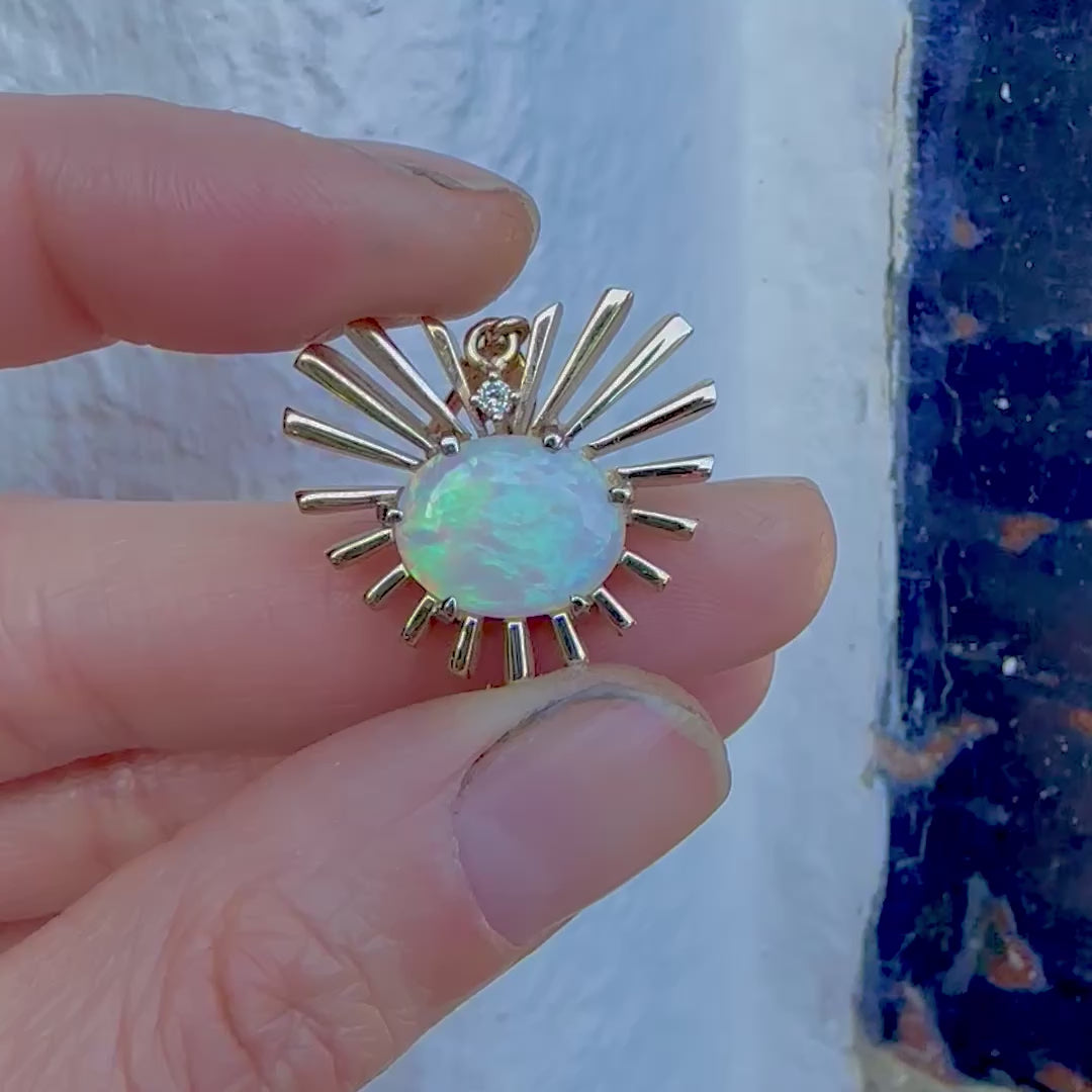 From our Divine Light Collection, this pendant features an beautiful Australian opal, that flashes a range of colors including blue, green, pinks, and oranges depending on the angle. Set in the center of a heart rays with a single bright white diamond accent. Crafted in 14k yellow gold, complete with a push to open bail. This Pendant is ready for a chain of your choosing. You can find a selection of our chains here.