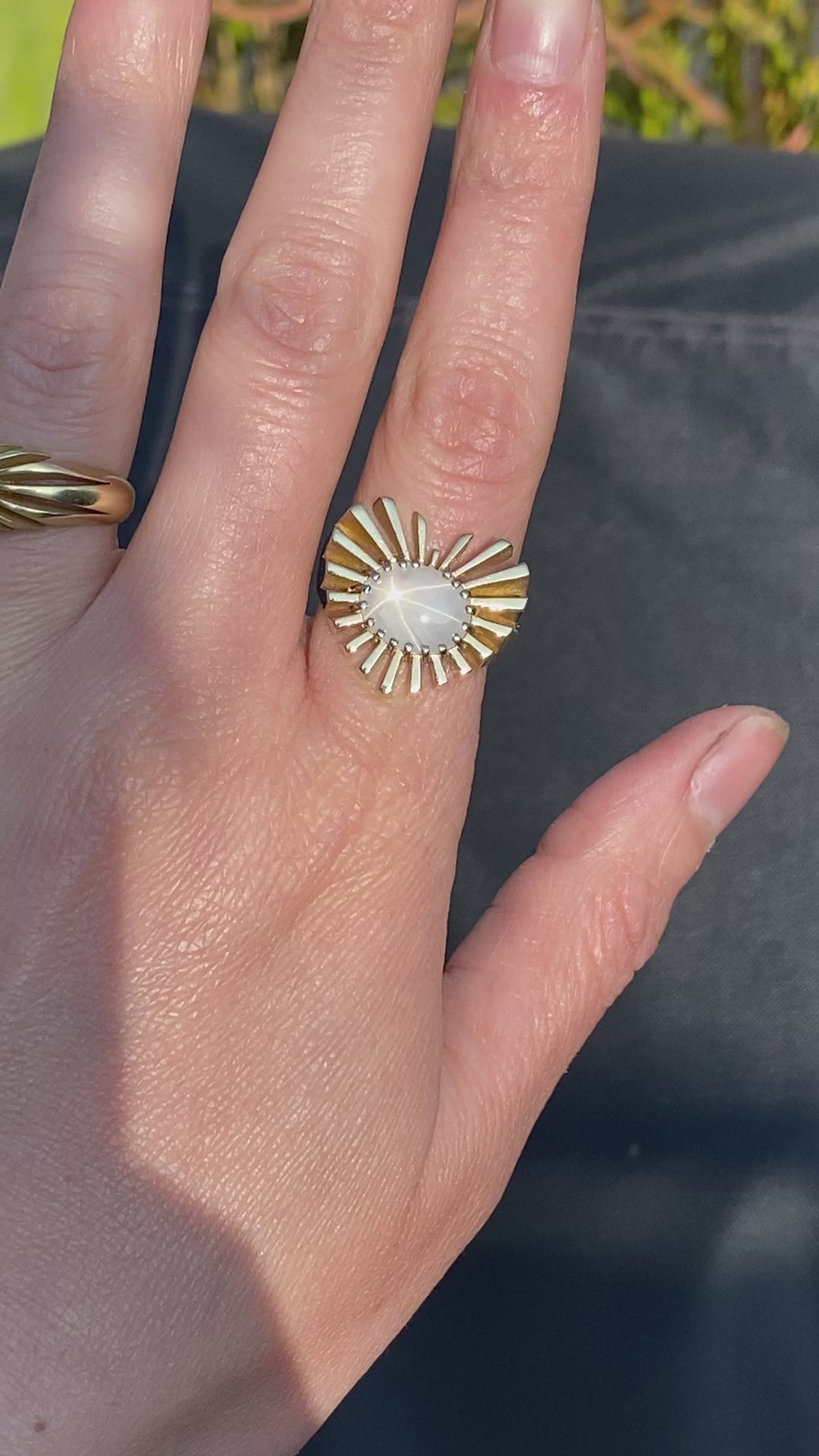 From our newest collection, Divine Light, this ring features a beautiful milky white star sapphire nestled in the center of rays the explode into a heart shape. Crafted in 14 karat yellow gold, the heart shaped face measures just under 3/4th inch and just over 3/4th inch.