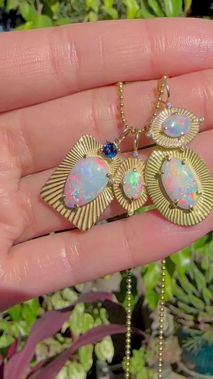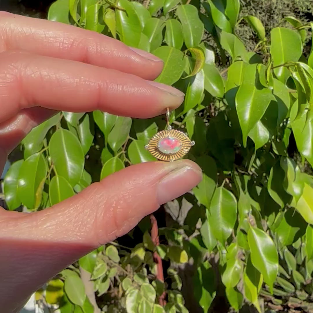 From our Light Collection, this charm features an Australian Opal sitting at the center of a halo shaped light charm accompanied with with Diamonds. Crafted in 14k yellow gold. Made with a 4mm bail opening, this charm is ready for a chain of your choosing. You can find a selection of our chains here.