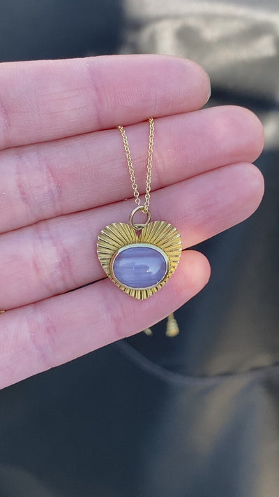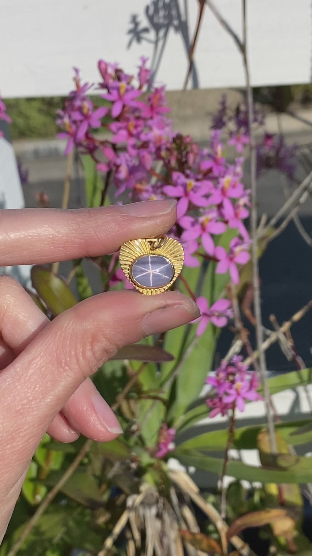 From the Light collection, this charm features a magnificent unheated purple Star Sapphire with sharp rays that dance across the stone in the sunlight. This special star sapphire is bezel at the center of an 18 karat yellow gold love light charm with a 3mm bail opening and is ready for a chain of your choosing. You can find a selection of our favorites here.