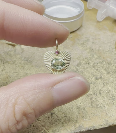 From the Light Collection, this charm features a beautiful light green sapphire at the center of a heart shaped light charm. Crafted in 14 karat yellow gold with a pink sapphire accent stone, this charm is ready for a chain of your choosing.
