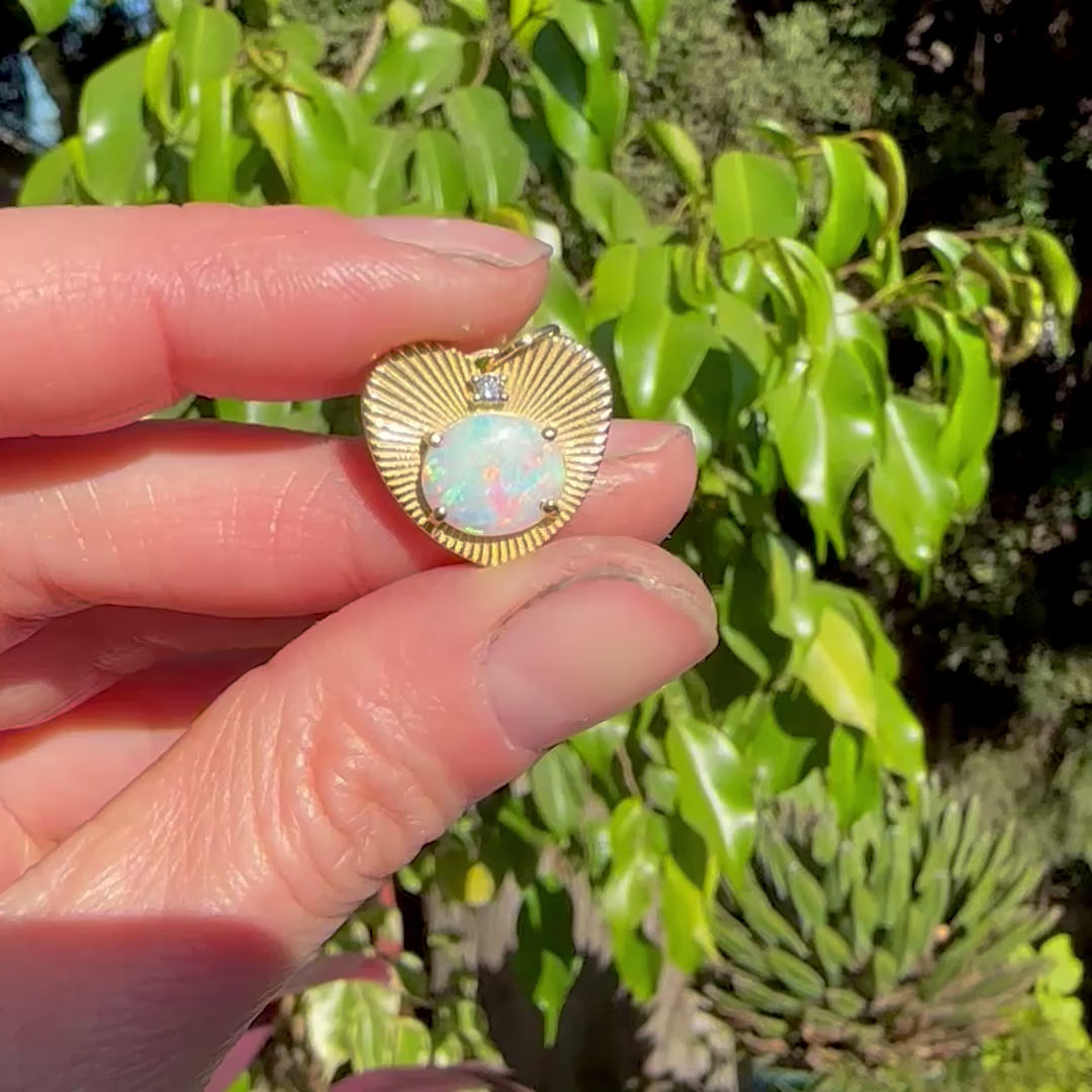From our Light Collection, this charm features a soft Australian opal with a white diamond accent, sitting in the center of a heart shaped light charm. Crafted in 14k yellow gold and completed with a white diamond accent. Made with a 4mm bail opening, this charm is ready for a chain of you choosing. You can fins a selection of our chains here.